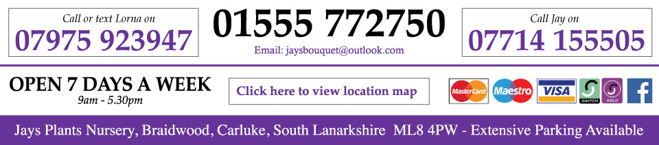 Jay’s Bouquets delivers to a wide area of South Lanarkshire. These areas include: Florists in Braidwood, Florists Lanark, Florists Carluke, Florist Wishaw, Florists Larkhall Other areas in South Lanarkshire: Auchenheath, Blackwood, Carmichael, Carnwath, Carstairs, Crawford, Crossford, Dalserf, Douglas, Forth Kilncadzow, Kirkfieldbank, Kirkmuirhill, Law Village, Lesmahagow, Newbigging, New Lanark, Pettinain, Quothquan, Symington & Thankerton |