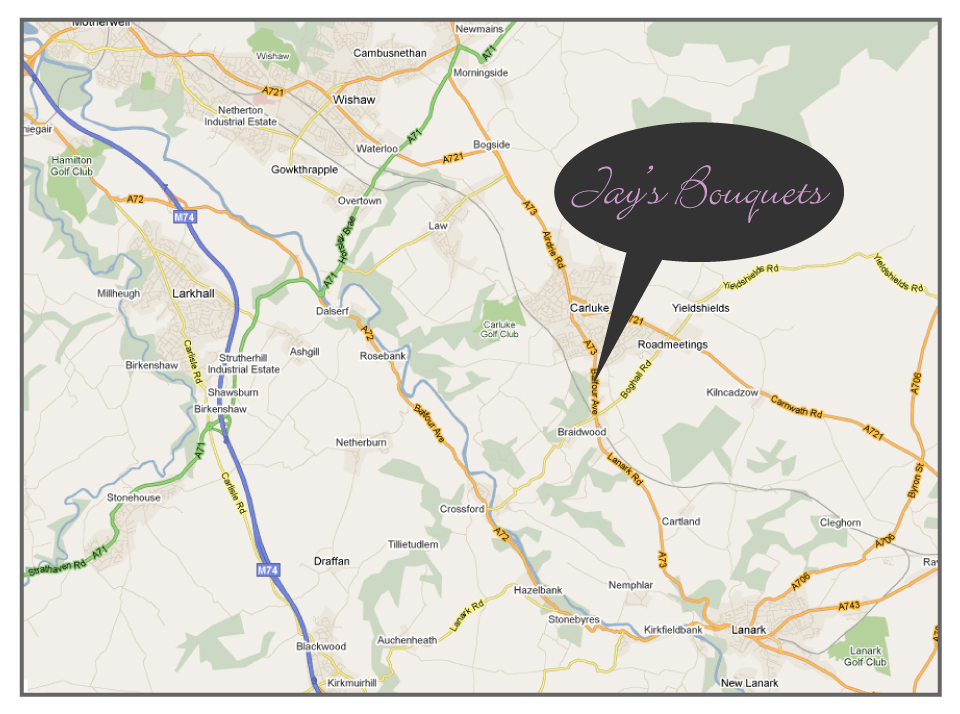 Jay’s Bouquets delivers to a wide area of South Lanarkshire. These areas include: Florists in Braidwood, Florists Lanark, Florists Carluke, Florist Wishaw, Florists Larkhall Other areas in South Lanarkshire: Auchenheath, Blackwood, Carmichael, Carnwath, Carstairs, Crawford, Crossford, Dalserf, Douglas, Forth Kilncadzow, Kirkfieldbank, Kirkmuirhill, Law Village, Lesmahagow, Newbigging, New Lanark, Pettinain, Quothquan, Symington & Thankerton |